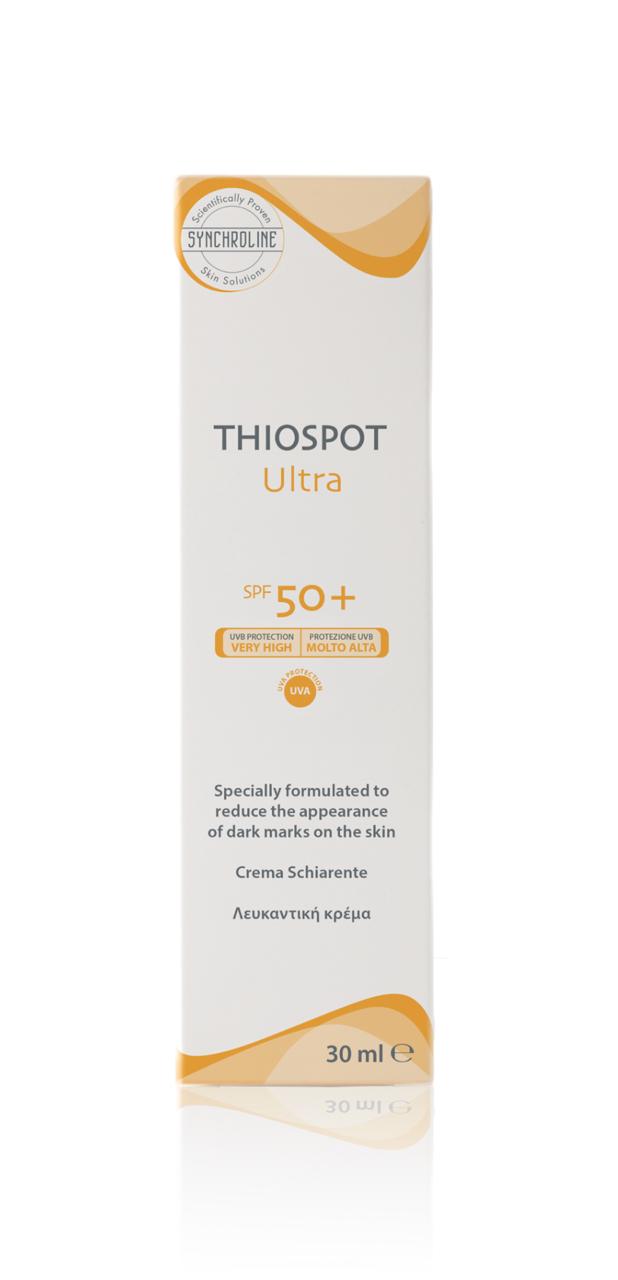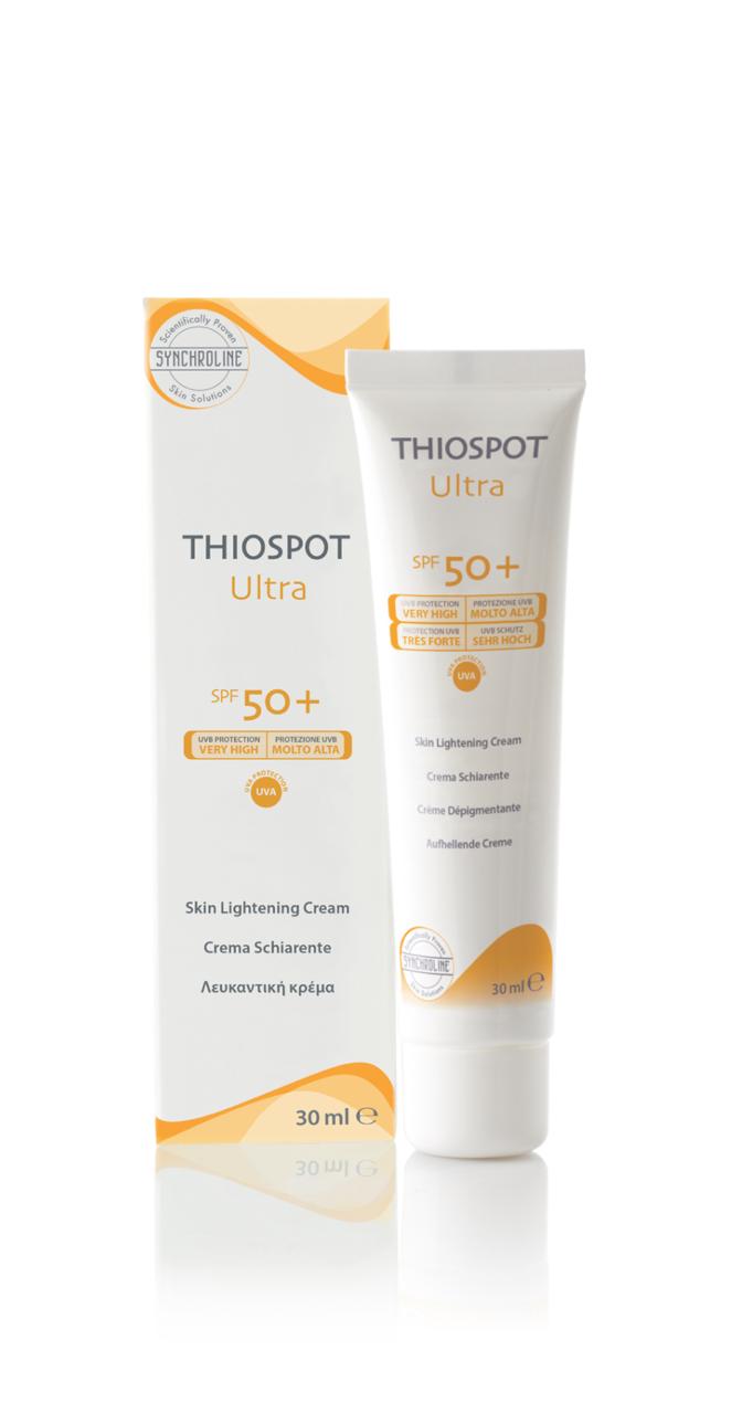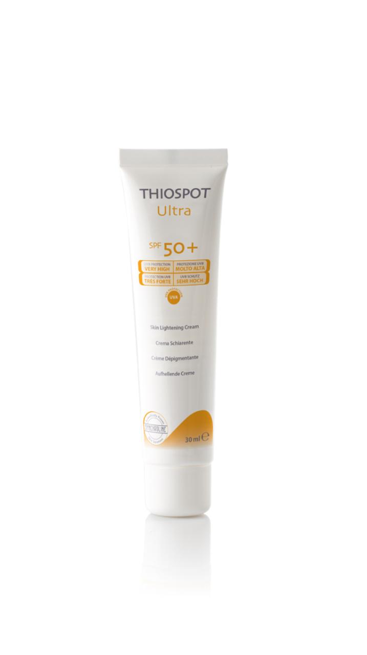 Thiospot Ultra SPF 50 + is a cream for dark spot correction that evens out skin tone with very high sun protection. Specifically formulated to reduce the visibility of widespread and localized epidermal dark spots melanin origin. It contains UVA and UVB sunscreens(SPF 50 +-very high protection.
